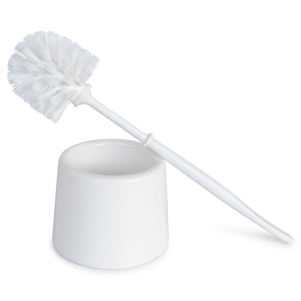 Conjunto branco de escova sanitária com base em plástico resistente.