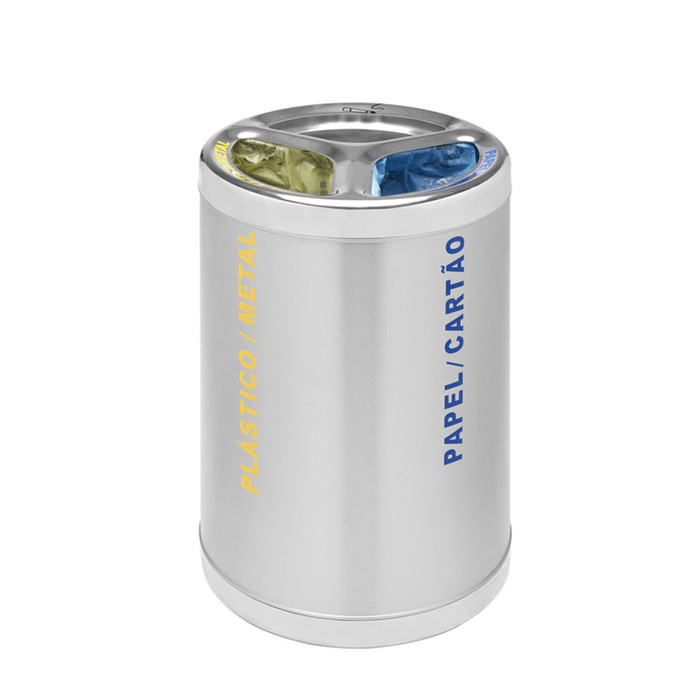 Ecoponto redondo com 3 entradas de reciclagem seletiva, totalmente em aço inox escovado.