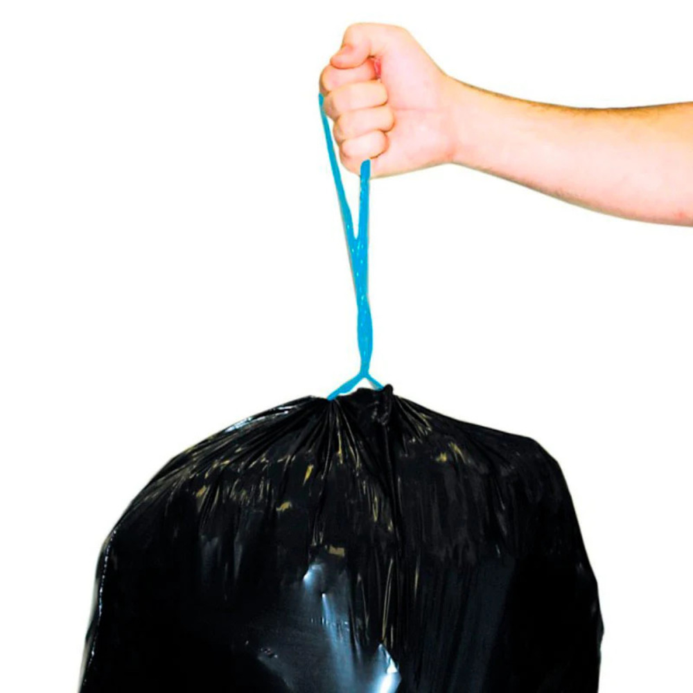 Saco plástico preto para lixo com fecho fácil. Embalagem de 6 unidades.