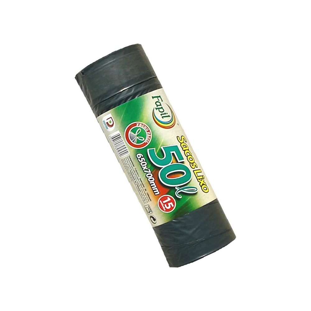 Saco plástico preto resistente c/ fecho fácil para lixo. Embalagem de 15 unidades.