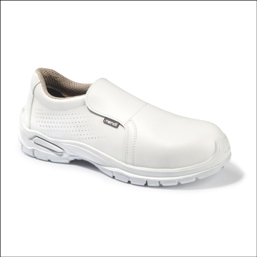 Sapato com gáspea em microfibra branca repelente à água. Forro em espuma 100% poliamida.